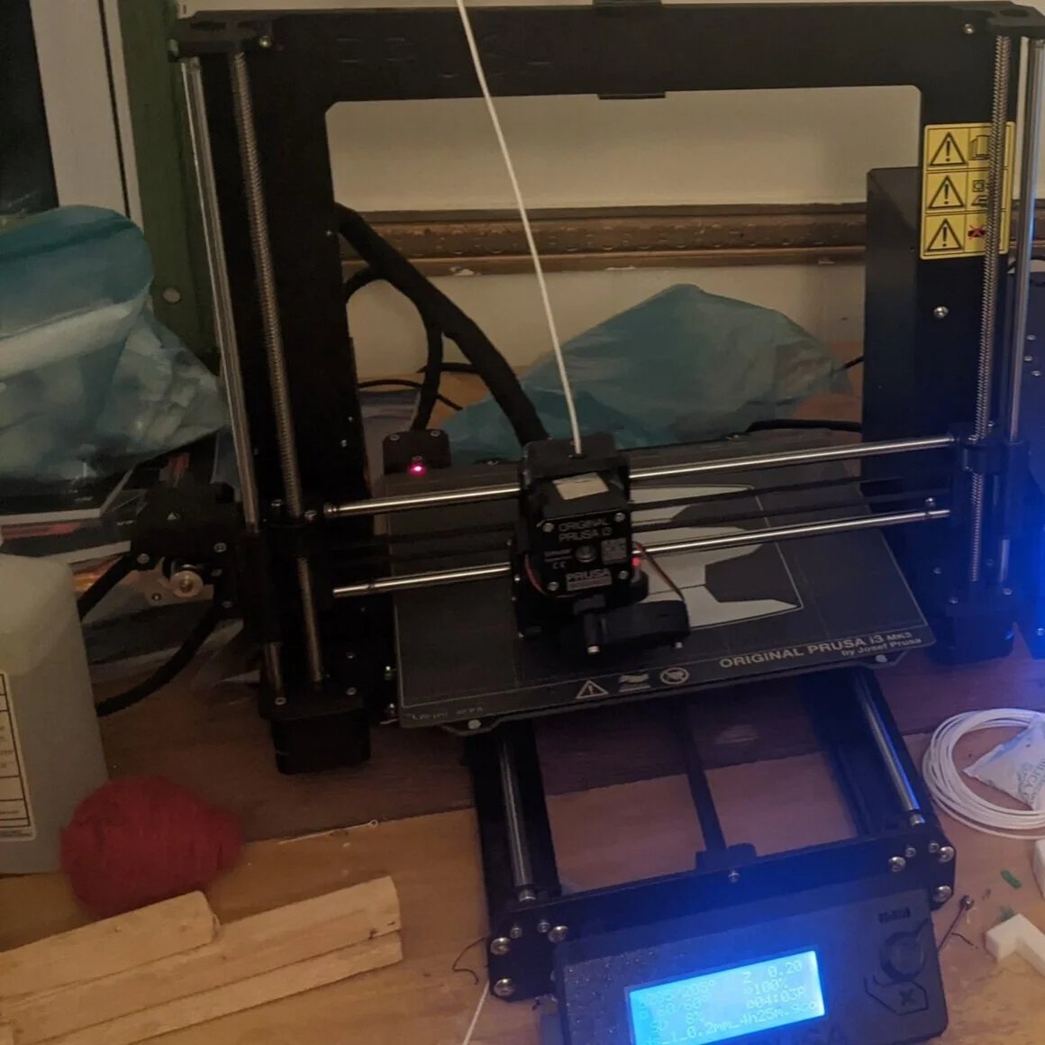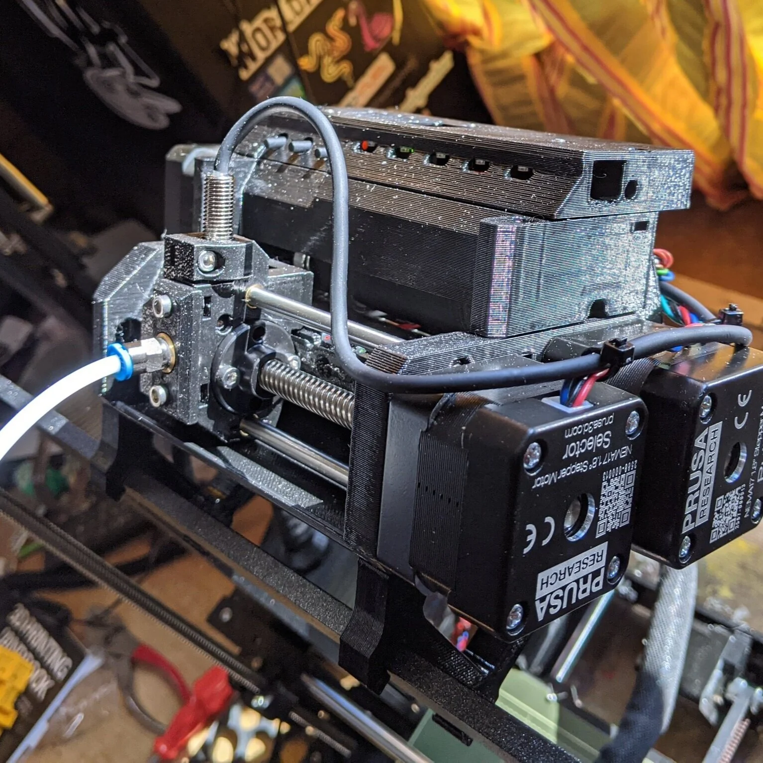 I also have a pair of Prusa i3 MK3S printers also from Prusa Research, both equipped with a Multi-Material Upgrade (MMU) unit, which allows me to print with up to five separate filaments simultaneously using only one nozzle. This is slightly less efficient in terms of filament and slightly more prone to mechanical issues while loading and unloading, but a space efficient way to print with multiple materials at once on an otherwise standard printer layout.